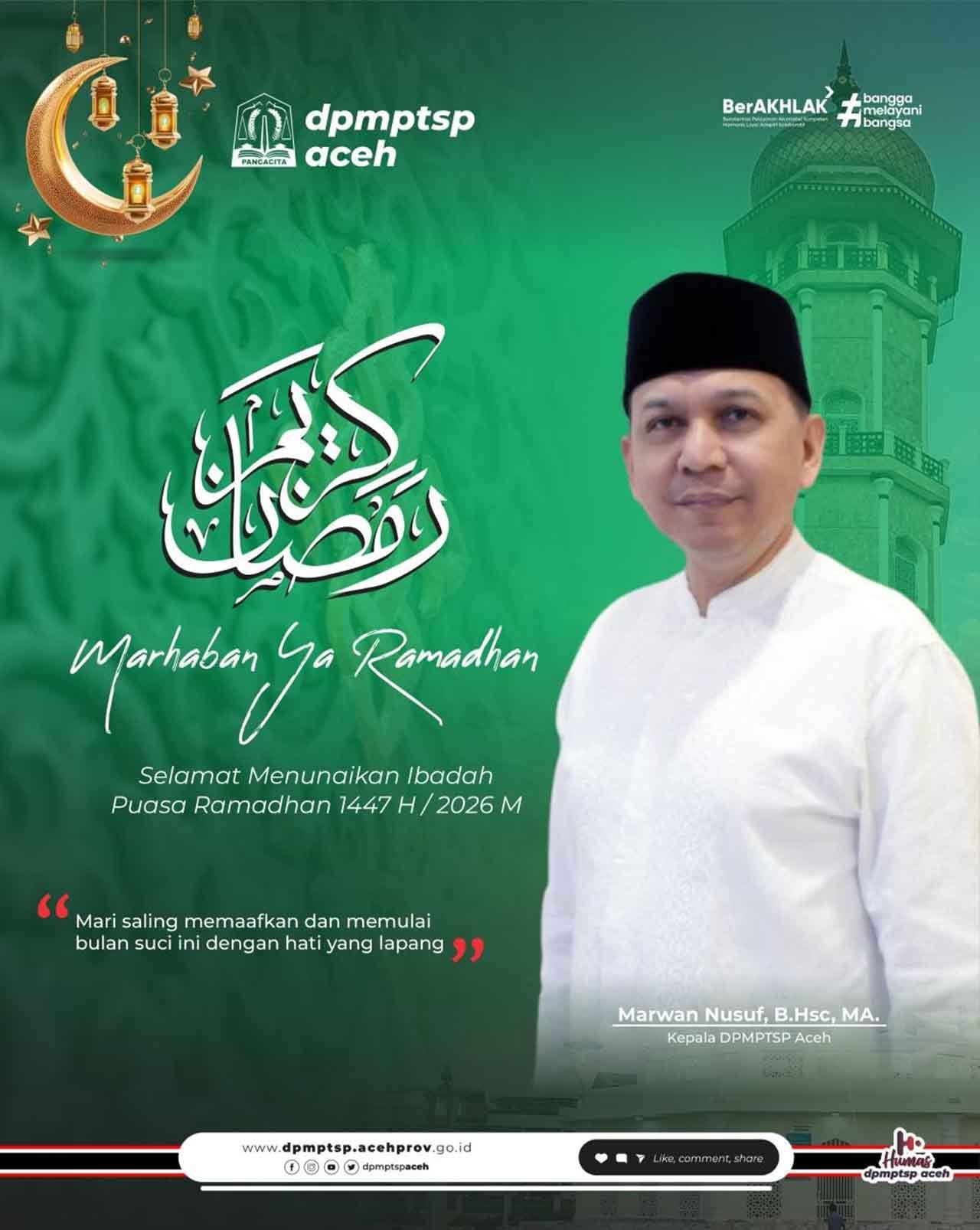 MEDIANAD.COM, BANDA ACEH: Kepala Dinas (Kadis) Penanaman Modal dan Pelayanan Terpadu Satu Pintu (DPMPTSP) Aceh, Marwan Nusuf, B.HSc., M.A sembari mengucapkan Selamat Menyambut Bulan...