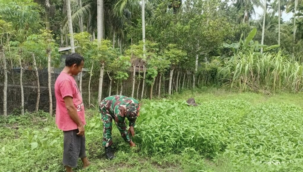 MEDIANAD.COM, SABANG – Dalam upaya mempererat hubungan dengan masyarakat sekaligus mendukung ketahanan pangan, Babinsa 02 Gampong Batee Shoek Koramil 02/Sukakarya Kodim 0112/Sabang, Sertu Budi Syahputra, melaksanakan kegiatan komunikasi sosial (Komsos) dengan menyambangi warga binaannya yang sedang memanen daun kangkung.