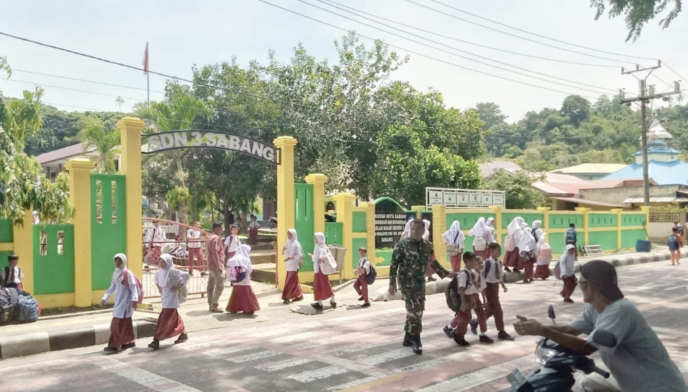 MEDIANAD.COM, SABANG – Dalam upaya meningkatkan keselamatan para pelajar di lingkungan sekolah, Babinsa 06 Gampong Kuta Timu Koramil 02/Sukakarya Kodim 0112/Sabang, Serma Sutrisno, membantu penyebrangan siswa-siswi SDN 3 Sabang di Gampong Kuta Timu, Kecamatan Sukakarya, Kota Sabang, Selasa (14/10/2025).
