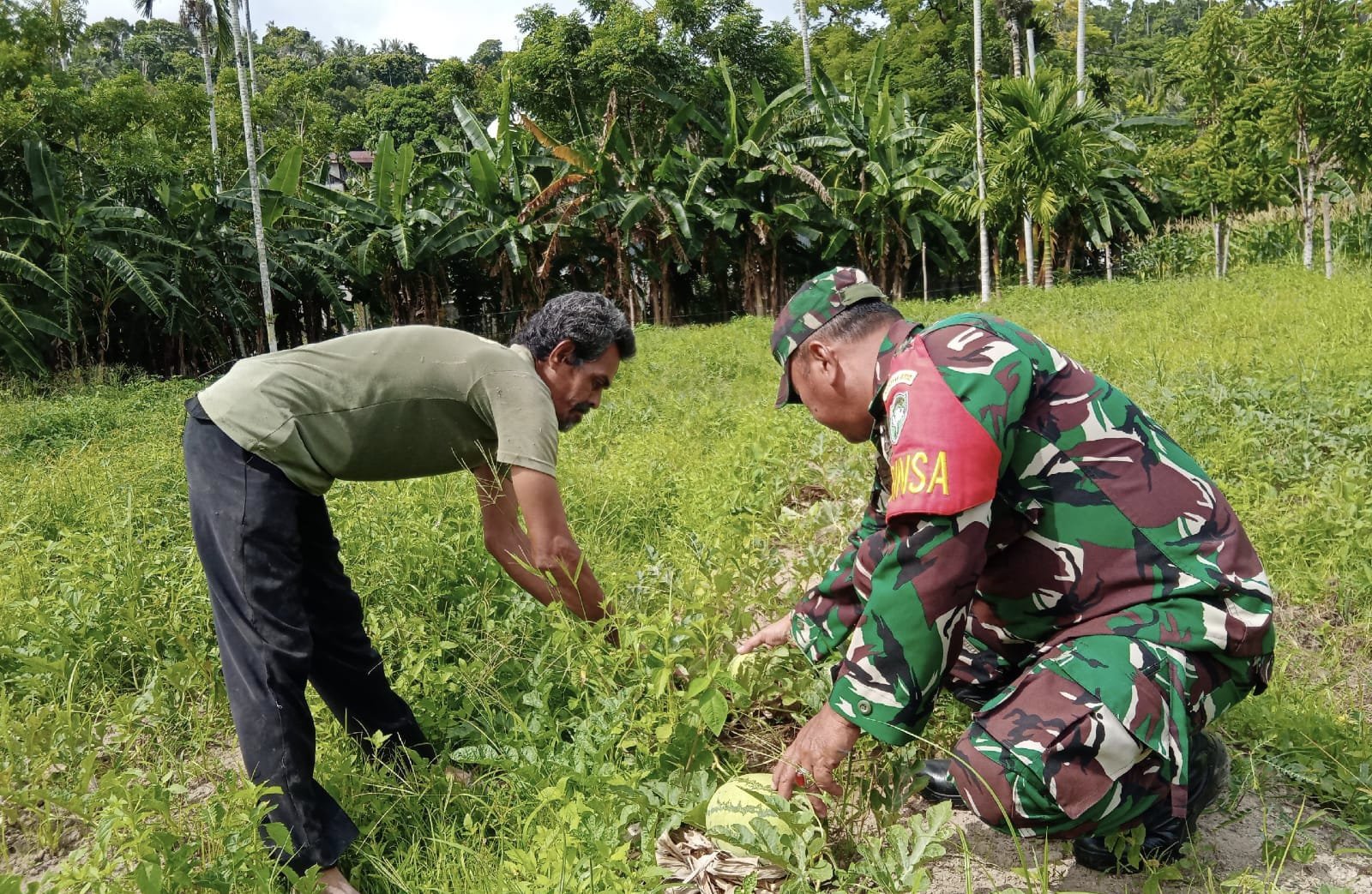 Kegiatan ini dilakukan bersama salah satu petani setempat, Armia, yang tengah membersihkan lahan dan merawat tanaman semangka miliknya. Babinsa tampak berbaur dengan warga, ikut mencabut rumput liar serta menata tanaman agar tumbuh dengan baik dan menghasilkan buah berkualitas.