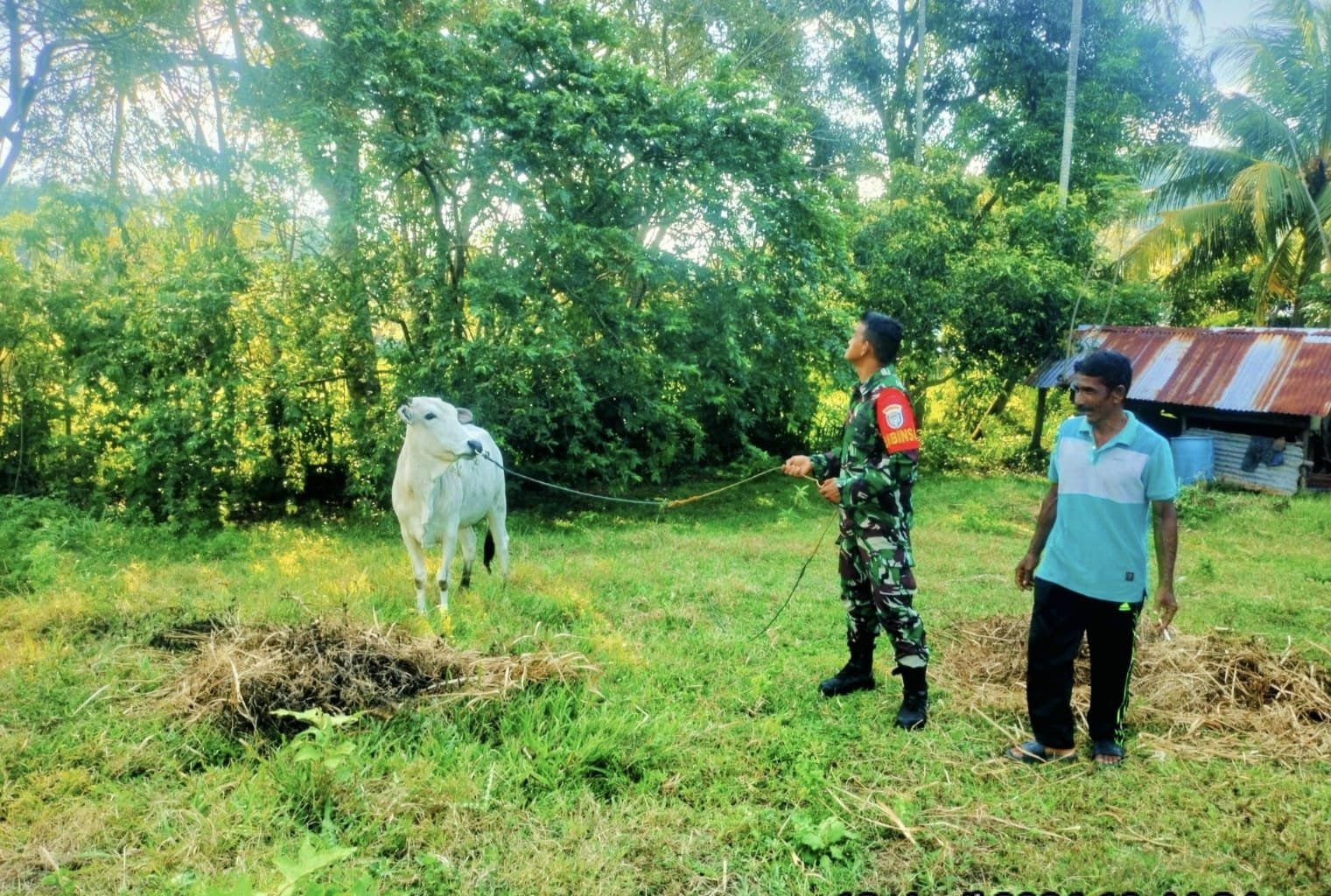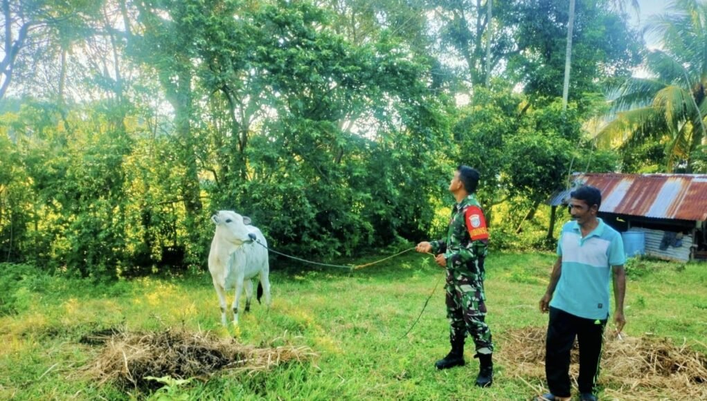 MEDIANAD.COM, SABANG – Peran aktif aparat kewilayahan kembali terlihat dalam upaya mendukung program ketahanan pangan nasional. Babinsa Gampong Krueng Raya Koramil 02/Sukakarya Kodim 0112/Sabang, Sertu Hendra, turun langsung mendampingi warga peternak sapi di wilayah binaannya, Senin (13/04/2026).