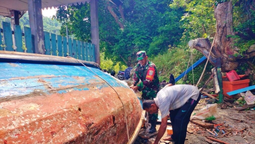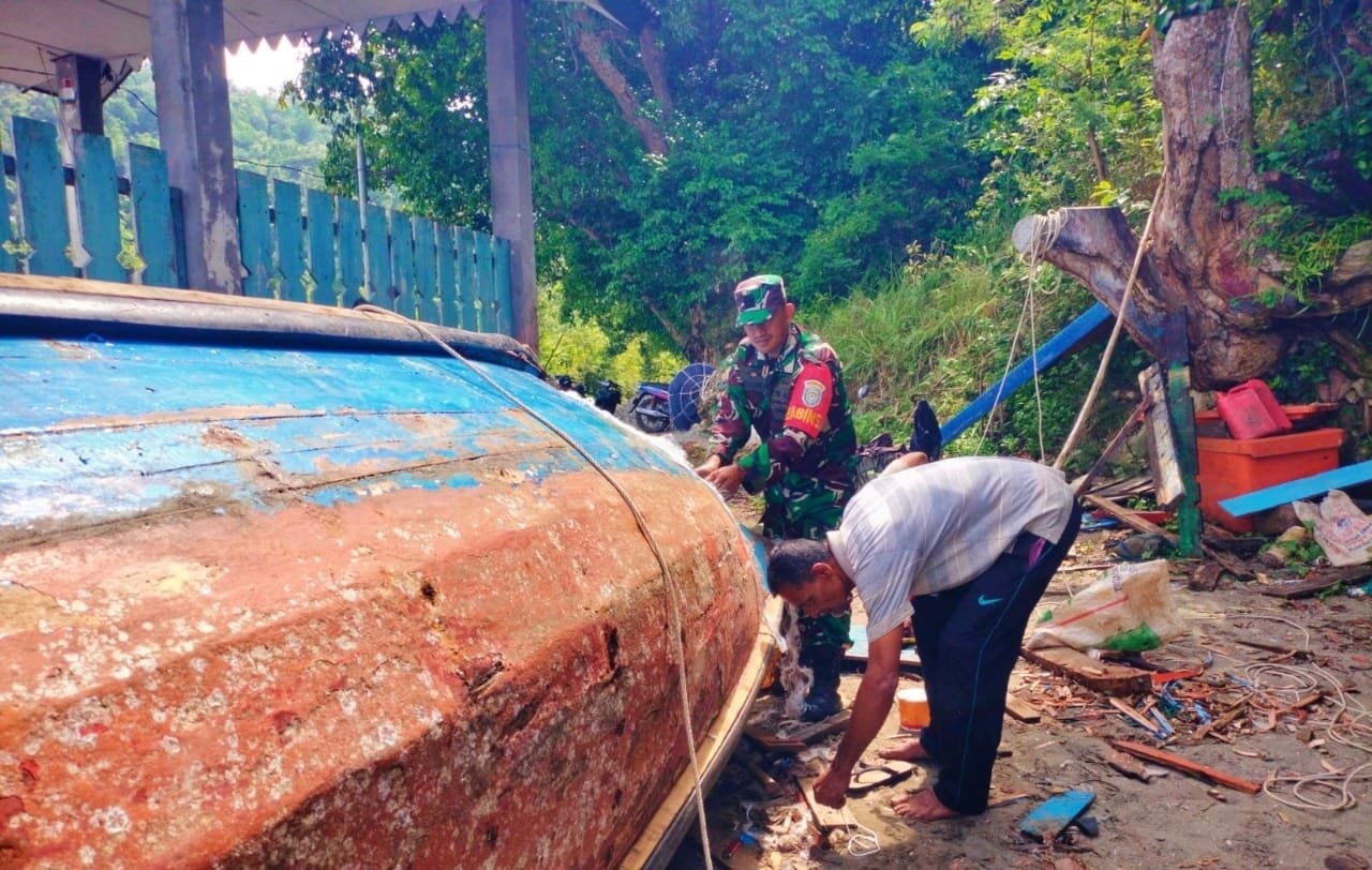 Perahu milik nelayan tersebut diketahui mengalami kerusakan akibat faktor usia, sehingga berpotensi membahayakan saat digunakan melaut. Melihat kondisi itu, Babinsa bersama Panglima Laot dan para nelayan setempat bergerak cepat melakukan perbaikan.