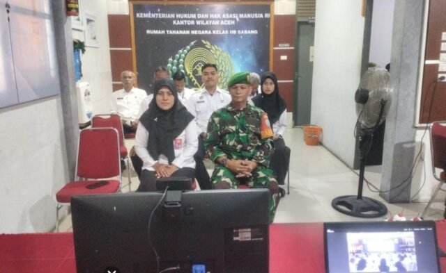 MEDIANAD.COM, SABANG — Babinsa Gampong Kuta Ateuh, Koramil 01/Sukajaya, Kodim 0112/Sabang, Serma Syafrial, menghadiri kegiatan Zoom Tasyakuran Hari Bakti Pemasyarakatan ke-61 yang diselenggarakan oleh Kementerian Imigrasi dan Pemasyarakatan Republik Indonesia. Kegiatan ini dilaksanakan bersama jajaran personel Rutan Kelas IIB Sabang dan berlangsung di kantor Rutan Kelas IIB Sabang, Jurong M Thaib, Gampong Kuta Ateuh, Kecamatan Sukakarya, Kota Sabang, (28/4/2025).