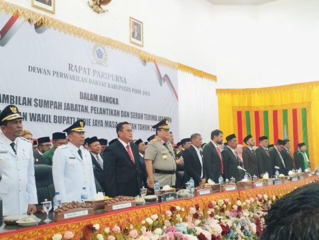 Sementara etem serimoni pelantikan lainnya, dimana ada “suasana haru dan semangat menyelimuti momentum pelantikan Bupati dan Wakil Bupati Pidie Jaya dikempatan tersebut”.