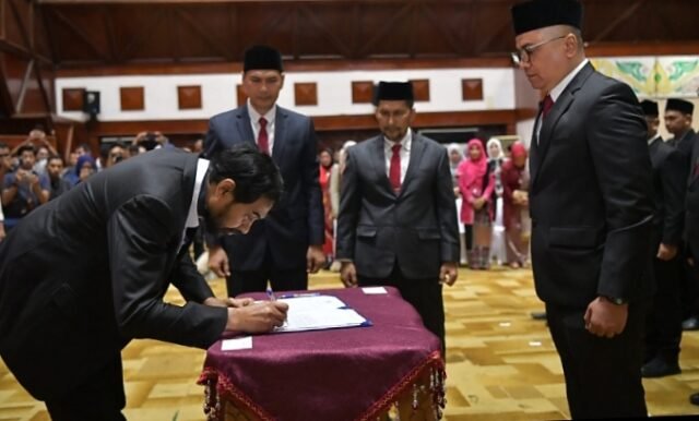 MEDIANAD.COM, BANDA ACEH — Gubernur Aceh, Muzakir Manaf (Mualem), melantik dan mengambil sumpah sejumlah pejabat pimpinan tinggi pratama (eselon II) di lingkungan Pemerintah Aceh dalam prosesi yang berlangsung di Anjong Mon Mata, Meuligoe Gubernur, Jumat malam, 27 Februari 2026.