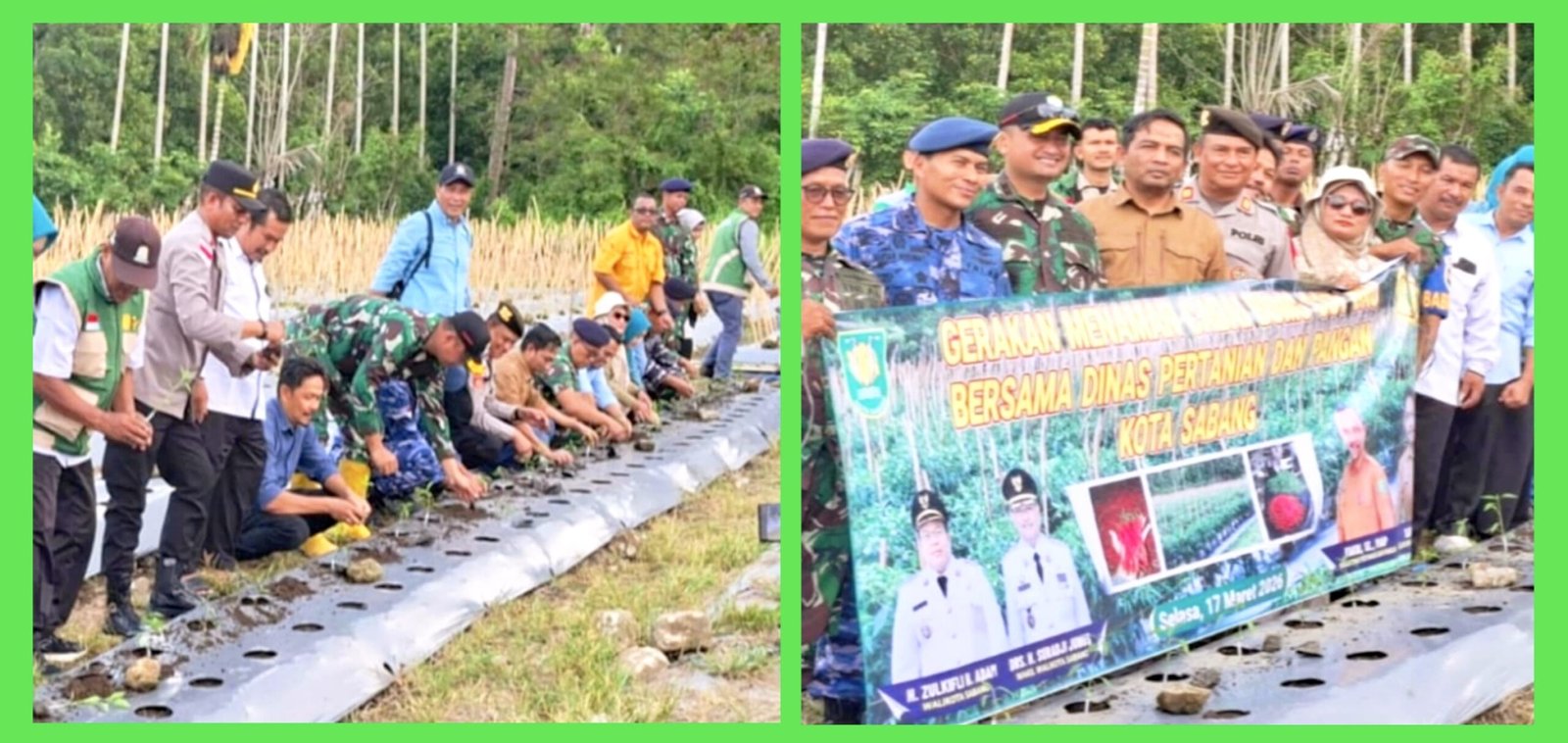 Kegiatan yang berlangsung sekitar pukul 16.30 WIB tersebut merupakan bentuk sinergi antara Pemerintah Kota Sabang, kelompok tani Ingin Jaya, serta unsur TNI dan instansi terkait dalam mendukung program ketahanan pangan di wilayah Kota Sabang.