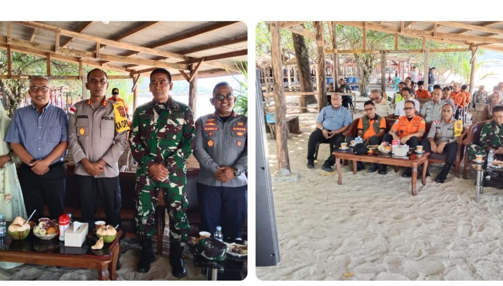 Asisten I Sekdakab, Farhan AP bersama Kapolres Aceh Besar (Abes) AKBP Chairul Ikhsan, mengikuti Zoom Meeting pemantauan objek wisata Operasi Ketupat 2026, juga dipimpin langsung Kapolri Jenderal Listyo Sigit Prabowo, serta untuk wilayah hukum Abes, pemantauan dipusatkan di Pantai Lampuuk, Lhoknga, Selasa (24/3/) 2026 juga ikut bergabung, Kodim 0101/KBA, jajaran Basarnas Aceh, Jasa Raharja Kota Banda Aceh. Plt Kadis Parpora Abes, Safrizal, S.Sos., M.Si, Kalaksa BPBD Ridwan Jamil, S.Sos., M.Si, perwakilan Dinas Kesehatan dan Puskesmas Lhoknga, jajaran TNI, Basarnas Aceh, Dishub, Jasa Raharja, serta Satpol PP dan WH. (foto/istimewa)