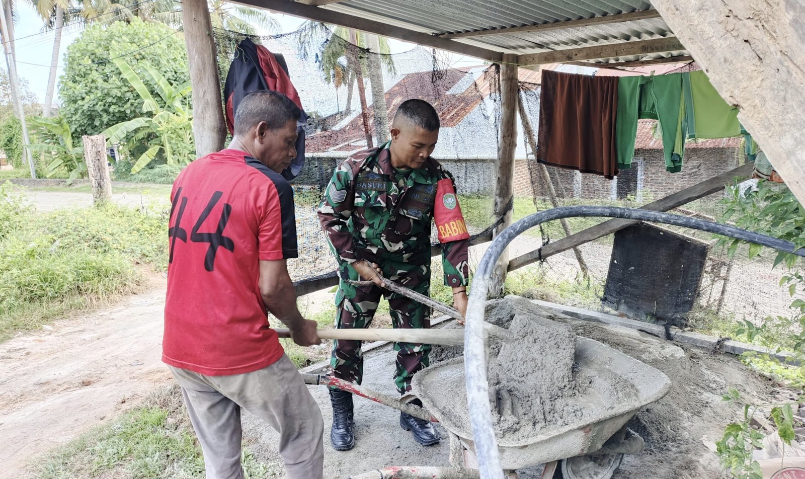 Dalam kegiatan tersebut, Serka Basuki terlihat ikut mengaduk semen bersama para pekerja bangunan. Aksi ini dilakukan sebagai bentuk kepedulian untuk meringankan beban pekerjaan warga sekaligus mempererat hubungan kebersamaan di wilayah binaan.