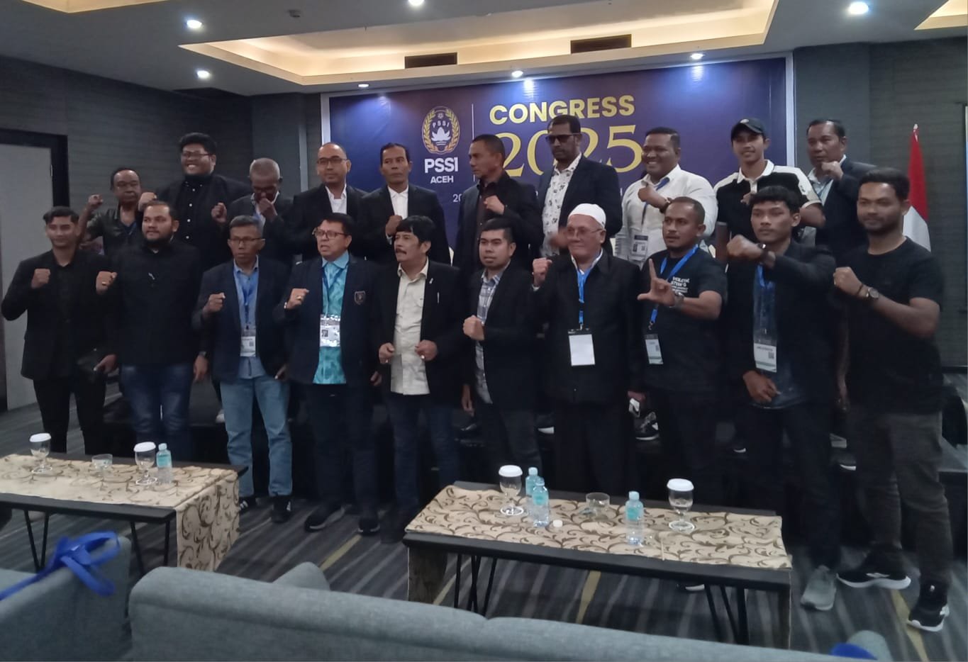 Ketua umum PSSI Aceh, Sekum, Waketum dan Exco, Foto bersama dengan perwakilan Club, dan foto dalam berita dengan anggota Askab juga Askot PSSI se Aceh, disela-sela usai Kongres tahunan, Kamis (20/11/2025) di Kyriat Hotel, Banda Aceh. (foto/kiriman panitia)