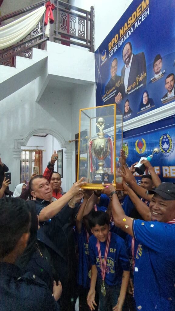 MEDIANAD.COM, BANDA ACEH: Ketua DPD NasDem Banda Aceh yang juga Sekretaris Fraksi NasDem DPR Aceh, H Heri Julius, S.Sos MM menyerahkan Piala Bergilir kepada Juara Festival Sepak Bola Usia Dini Restorasi Cup I tahun 2025, yakni disabet oleh Sekolah Sepak Bola (SSB) Barona, Banda Aceh.