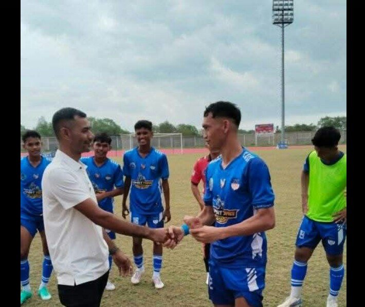 Ketua Umum PSAP Sigli, M Yusri Syamaun alias ‘Amat Tong’, beri ucapan selamat kepada pemainnya, usai menang 4-0 atas PSST Simpang-3 pada laga perdana Grup C Liga4 Aceh, di Stadion Blang Paseh, kota Sigli, Selasa sore. (foto/ist)