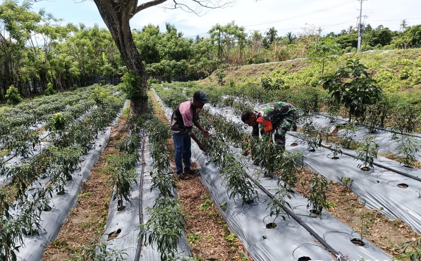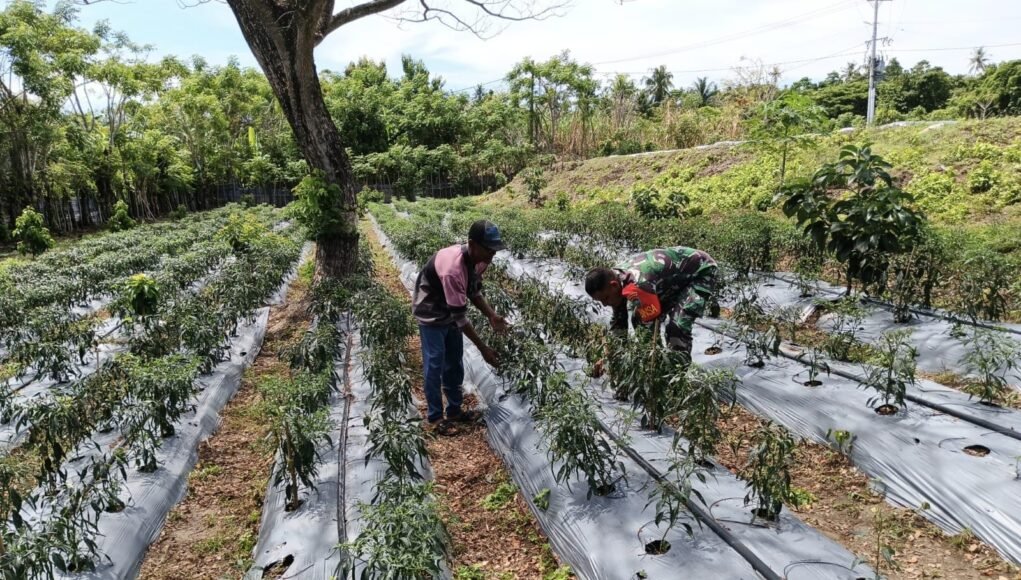 Dalam kegiatan tersebut, Sertu Darwis tampak bahu-membahu bersama salah satu warga, Bapak Bukari, merapikan lahan dengan membersihkan gulma yang tumbuh di sekitar batang cabai. Kegiatan sederhana ini menjadi bagian penting dalam menjaga kesuburan tanaman agar dapat tumbuh optimal dan menghasilkan panen yang maksimal.