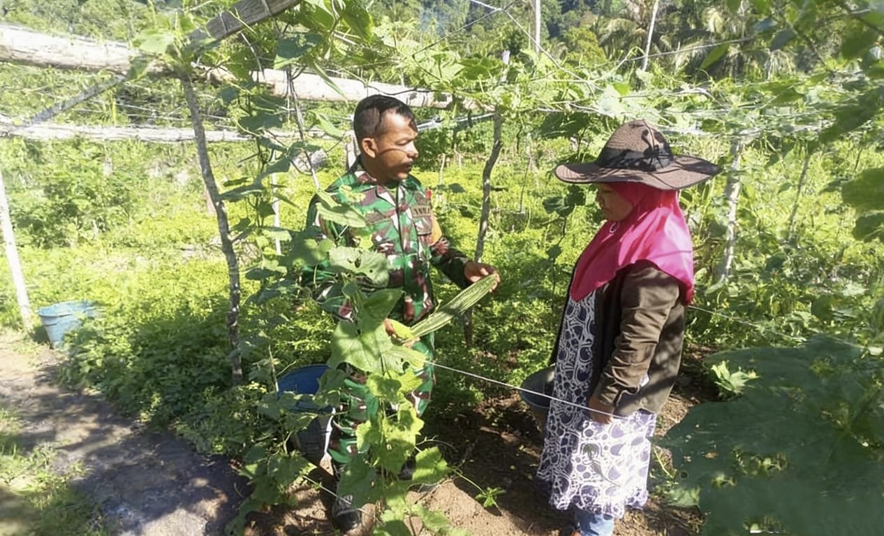 Dalam kegiatan tersebut, Sertu Junaidi mendampingi salah satu anggota kelompok tani (Poktan), Ibu Ani, dalam merawat tanaman gambas miliknya. Pendampingan dilakukan secara menyeluruh, mulai dari pembersihan gulma, penyemprotan hingga pemupukan tanaman.