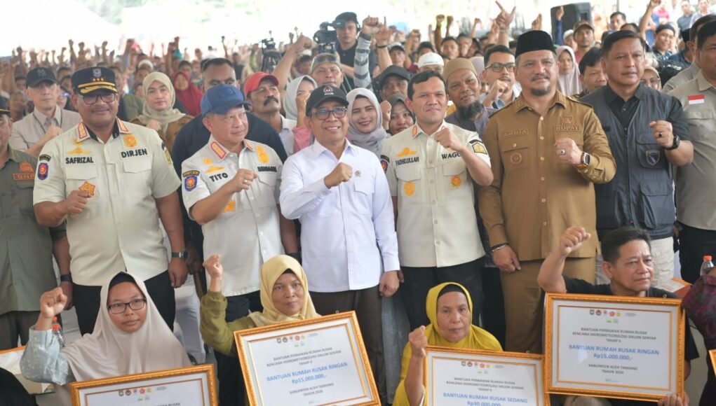 MEDIANAD.COM, ACEH TAMIANG — Wakil Gubernur Aceh, Fadlullah, SE, mendampingi Menteri Koordinator Bidang Pembangunan Manusia dan Kebudayaan (Menko PMK) RI, Pratikno, serta Menteri Dalam Negeri RI, Tito Karnavian, menyerahkan secara simbolis bantuan perbaikan rumah rusak bagi masyarakat terdampak bencana hidrometeorologi siklon senyap tahap II di Kabupaten Aceh Tamiang, Selasa (21/4/2026).