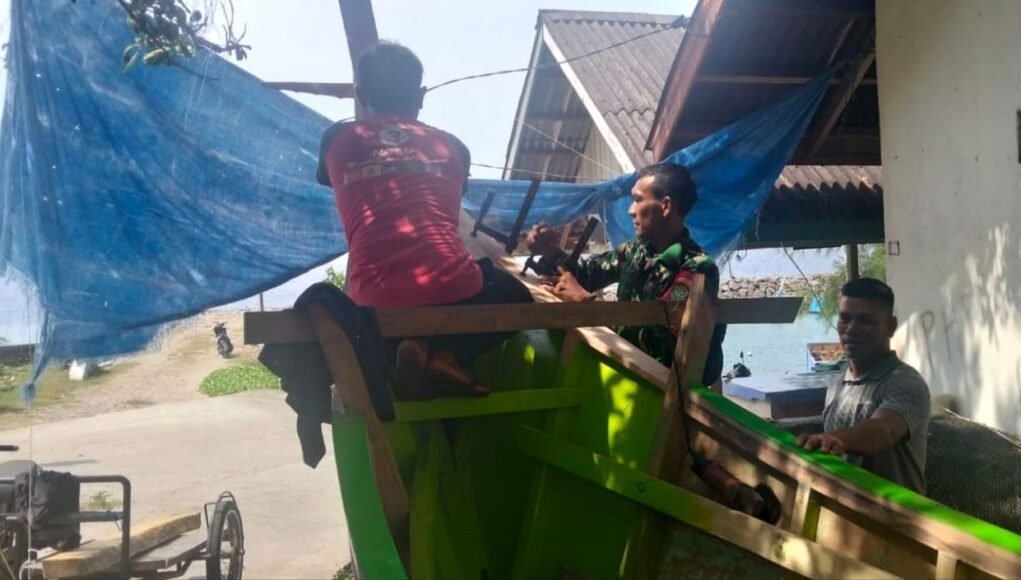 Kegiatan tersebut berlangsung pada Selasa (28/04/2026). Tanpa ragu, Serda Khadafi ikut bergotong royong bersama warga, membantu proses perbaikan perahu yang menjadi sarana penting bagi aktivitas sehari-hari masyarakat pesisir.
